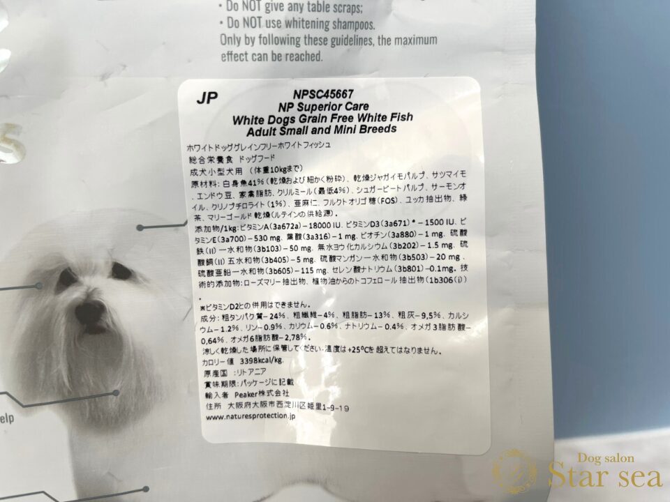 ※今回は「ホワイトドッグ グレインフリー ホワイトフィッシュ アダルト」の表記です。