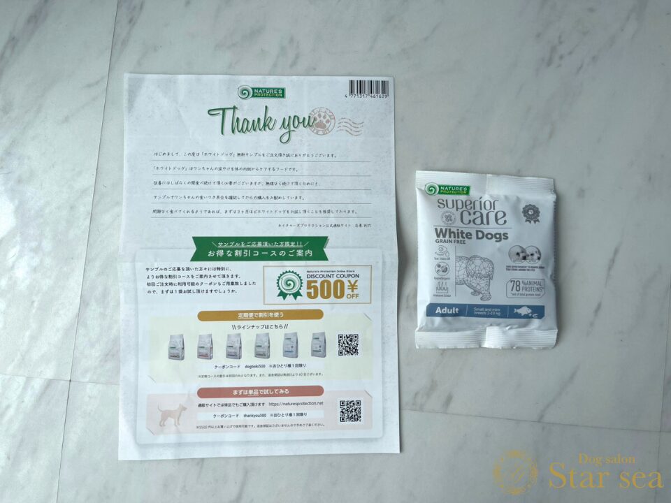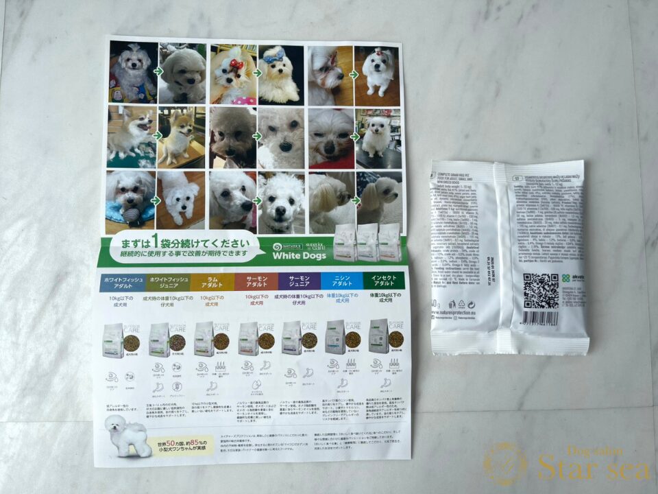中には、ホワイトドッグの紹介やクーポンが載ったチラシ1枚と、指定した種類のホワイトドッグシリーズのフード40g入りが1袋同梱されていました。