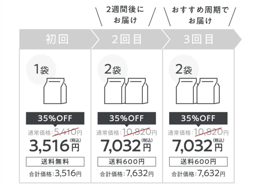 初回のお届けは1袋のみですが、2回目以降は2袋が届き、金額も2倍になります。
