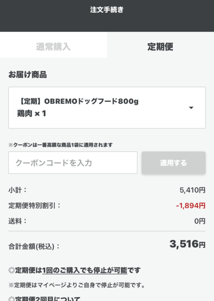 オブレモは「通常購入」と「定期便」のどちらでも注文できますが、初回限定の50%OFFクーポンが使えるのは定期便だけです。