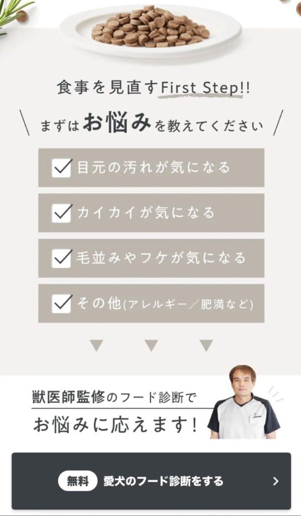 愛犬の年齢や体重、体質などを入力することで、ぴったりのフードを診断してもらえますよ。