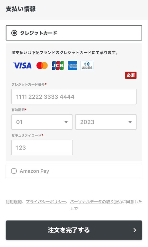 お支払い方法は「クレジットカード」または「Amazon Pay」の2種類から選べます。どちらも手数料はかかりません!