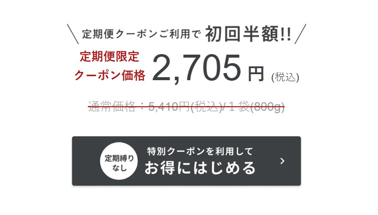 ただし、クーポンを利用すれば、初回の定期便に限り半額で購入することができます。なお、2回目以降は解約や休止の手続きをしない限り、定期的に商品が届く仕組みです。