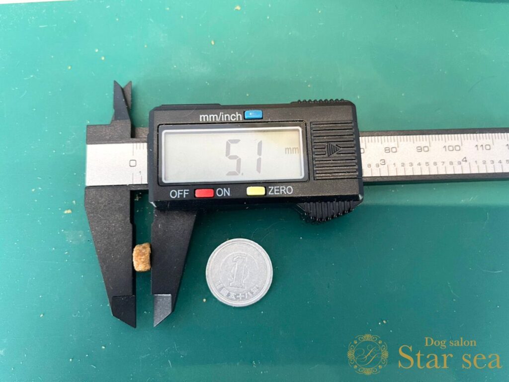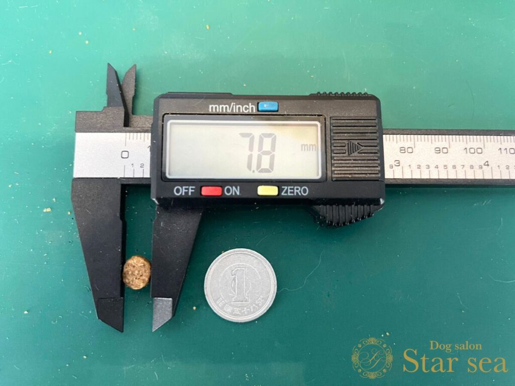 パーティーアニマルドッグフードの大きさを計測したところ、大きさは7.8㎜、厚さは5.1㎜でした。