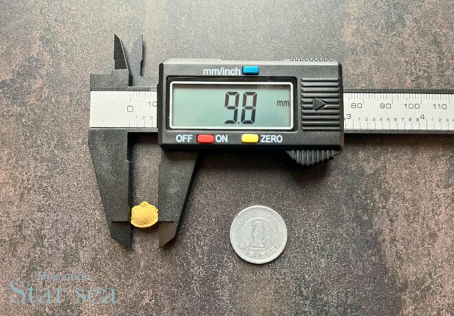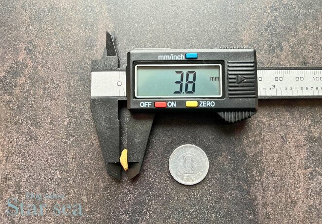 粒の大きさを測定すると9.8mm、厚みは3.8mmでした。