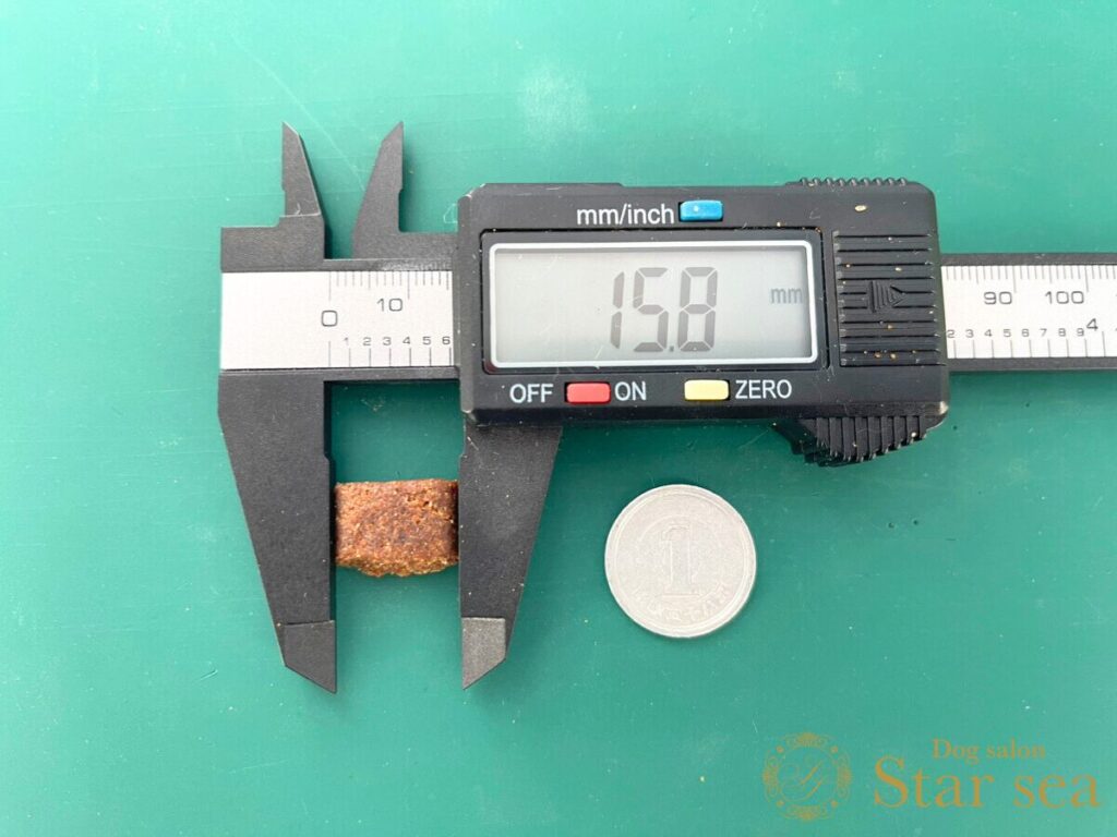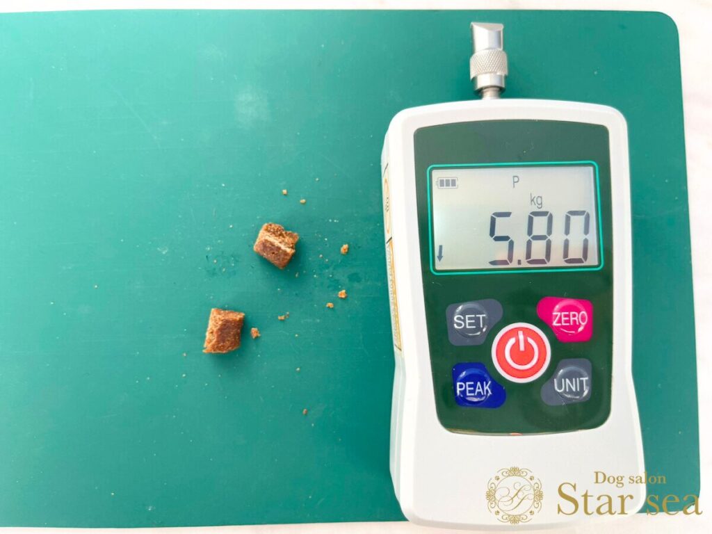 粒の硬さを硬度測定器で測ってみると、一般的なドライフードよりやや硬めではありますが、想像していたほどの硬さではありませんでした。