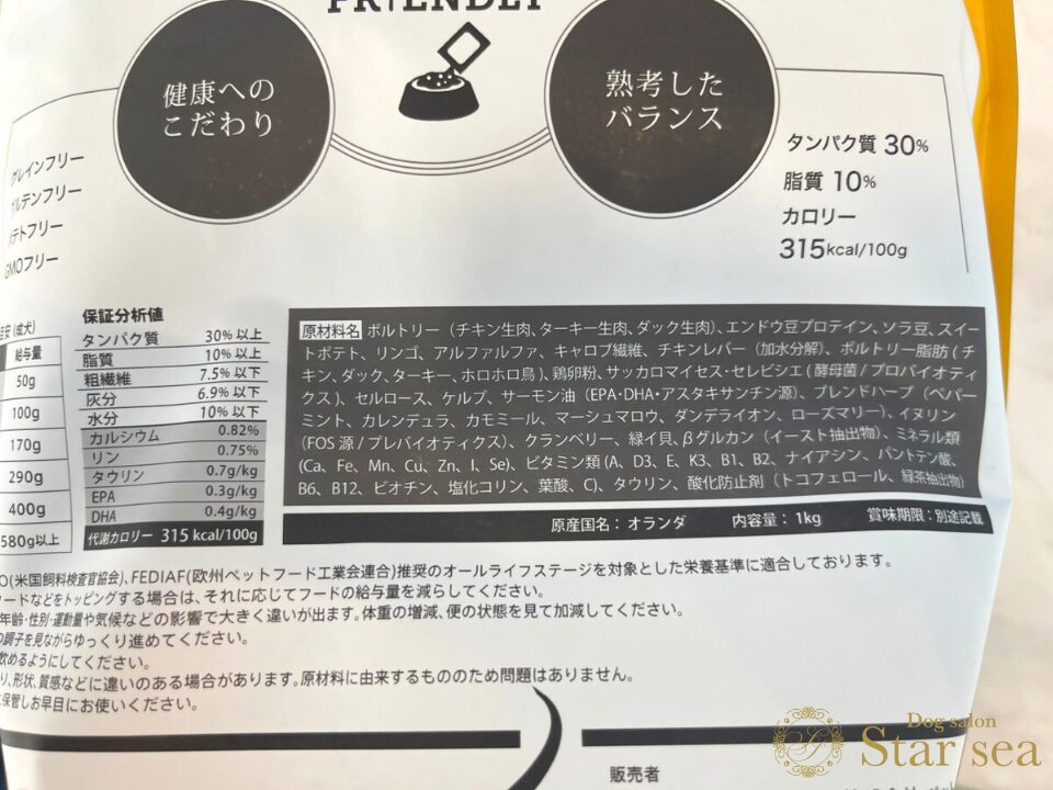 主原料には犬が消化しやすい良質な動物性タンパク質や、腸内環境をサポートするプロバイオティクスが配合されており、胃腸に優しいフードであることがうかがえます。