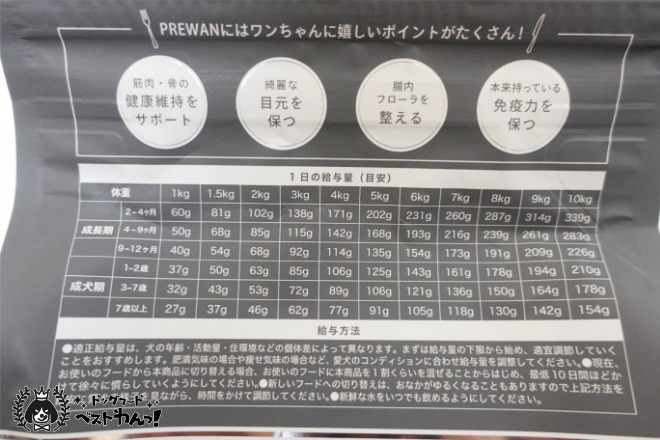 プレワン1日あたりの給餌量はパッケージ裏面に記載されています。