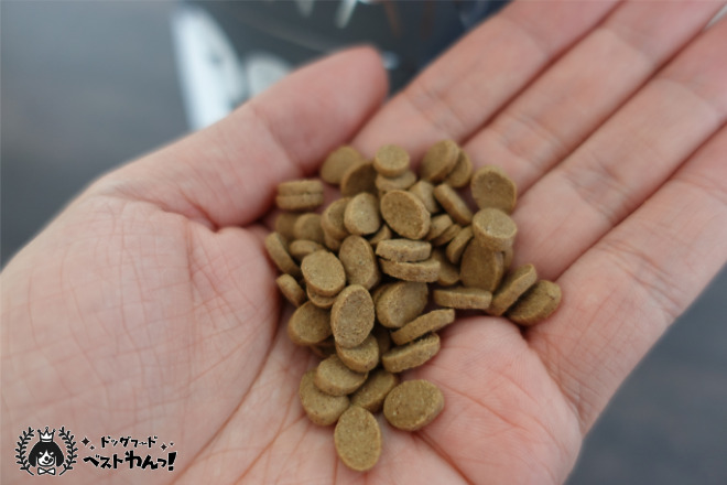 粒は少し大きめかもしれませんが、厚みはないので、顎の小さな小型犬でも食べることができるでしょう。