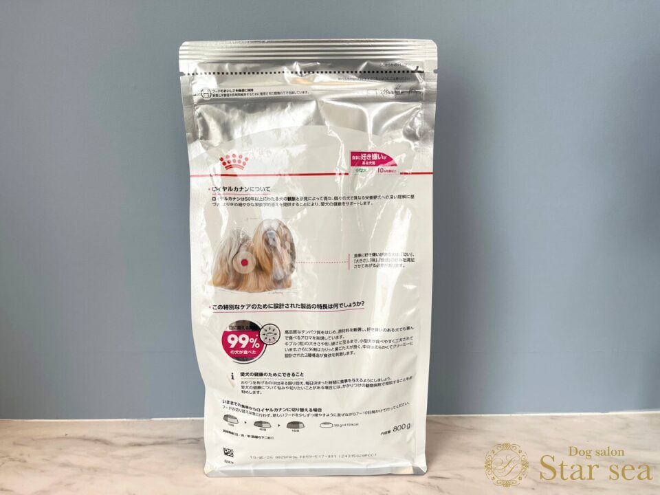 また、パッケージの下部や裏面には、ラサアプソと思われるモデル犬の写真も掲載されており、かわいらしさと親しみやすさも感じられます。
