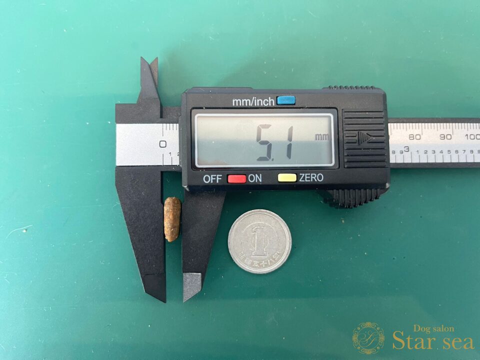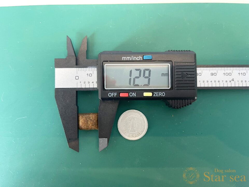「食事に好き嫌いがある犬用」の粒を測定してみると、直径が12.9㎜、幅が5.1㎜でした。一般的なフードと比べると、小型犬用にしては大きめです。