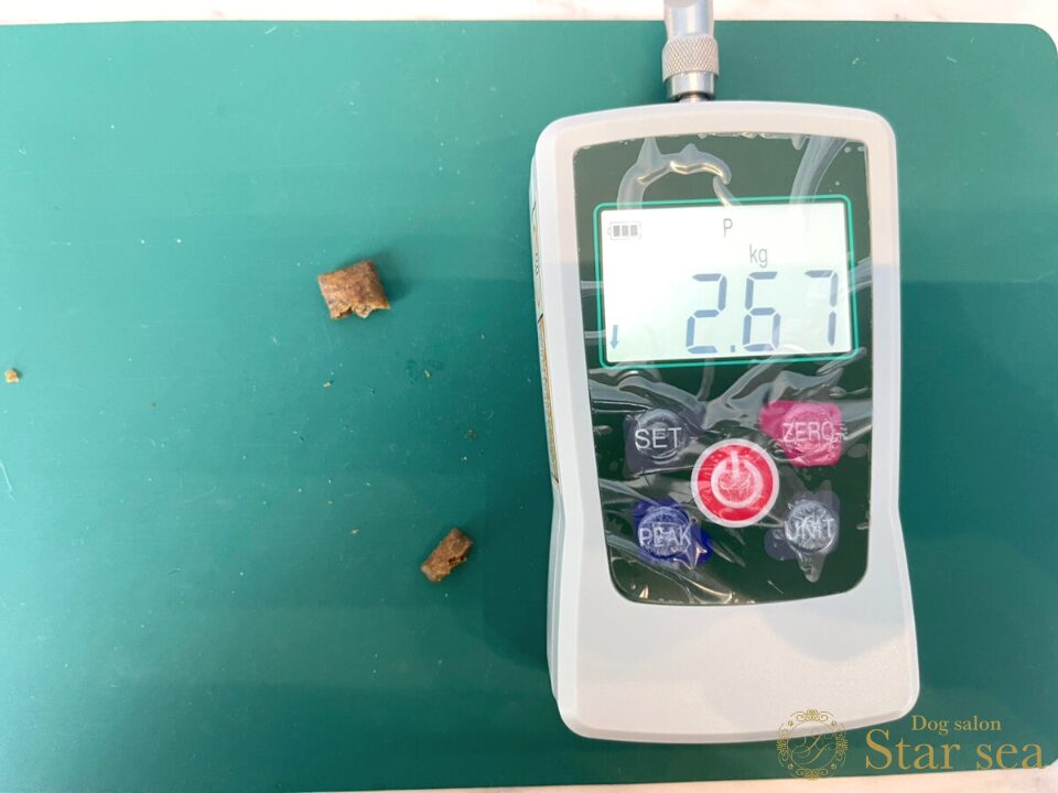 さらに、硬度測定器で粒の硬さを測定してみたところ、2.67㎏でした。見た目の大きさとは異なり、硬さは柔らかく、手でも簡単に割ることができるほどです。