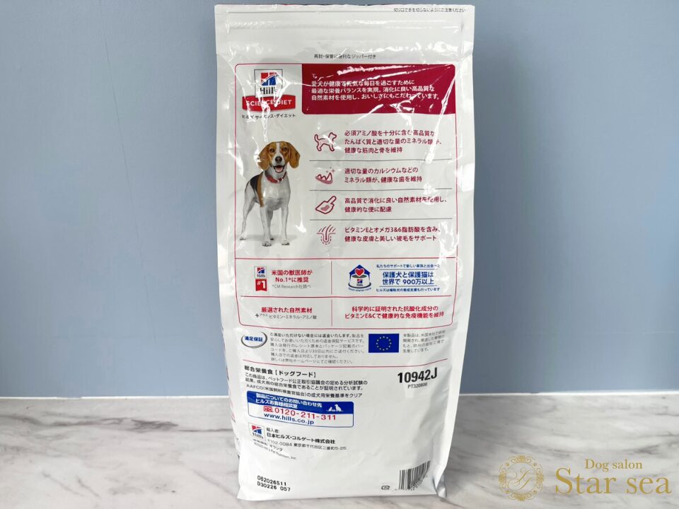 背面にはサイエンスダイエットならではの特徴がしっかりと記載されています。