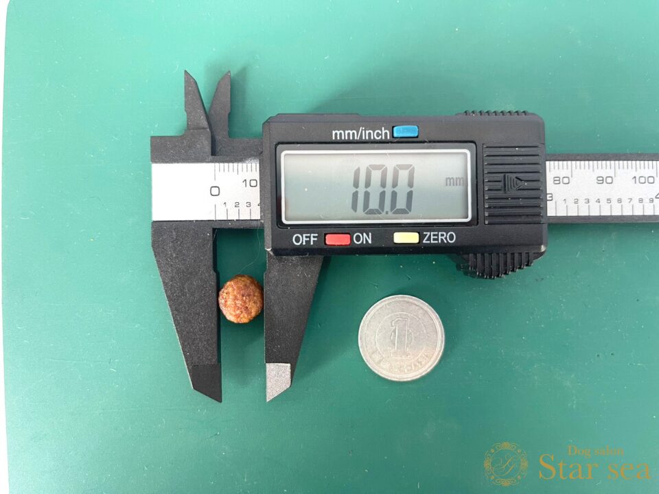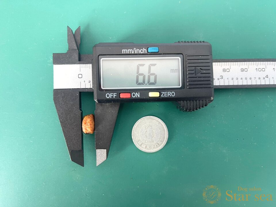 ヒルズサイエンス・ダイエット「アダルト1~6歳用 の小粒」の粒を測定したところ、直径は1cm、厚みは6.6mmでした。