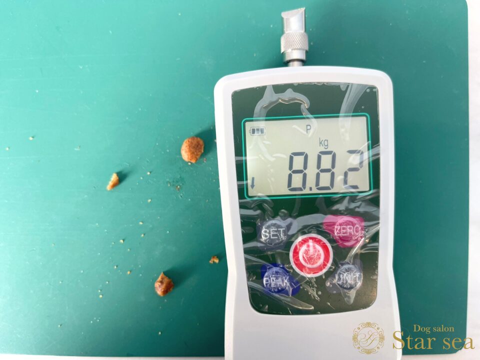 粒の硬さを硬度測定器で測ったところ、一般的な小粒タイプのドッグフードの中ではやや硬めという結果でした。