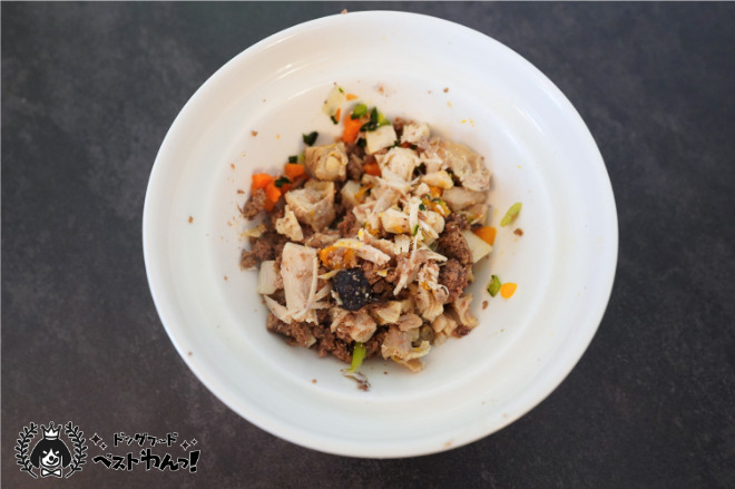 ペトコトフーズもほぼ国産素材の総合栄養食手作り風フードです。XAXAがゴロゴロ大きな食材が入っている形状なのに対し、ペトコトフーズは食材が細かく刻まれています。私の愛犬は小型で歯が悪い子もいるのでペトコトフーズの方が食べやすそうでした。