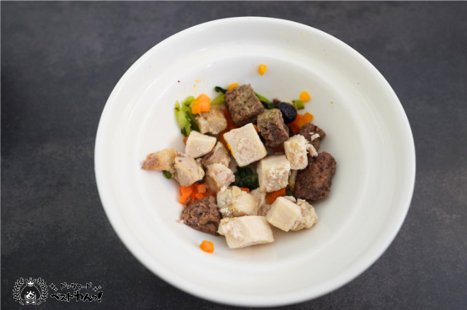 解凍時間は真夏の常温でも1時間ほどかかったので公式の20分には疑問を感じました。解凍に時間がかかることを考えると、前日から解凍しておけるペトコトフーズやココグルメの方が手間がかからないなぁと思ってしまいました。