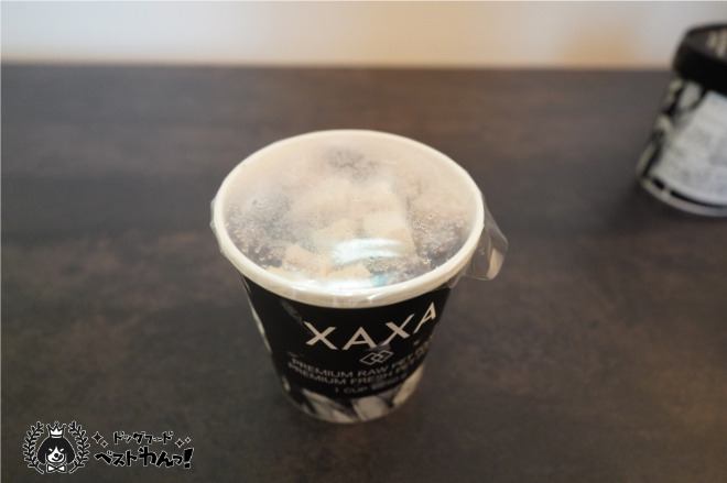 XAXAドッグフードのパッケージは今まであまり見たことがないようなカップ状です。紙の蓋を外すと二重でビニールの蓋がありました。