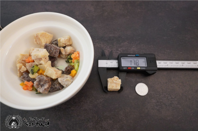 大きいお肉は1.7㎝程ありました。シニア犬などは食べづらいサイズかもしれませんが、柔らかくて簡単に手でほぐせるので問題なさそうです。