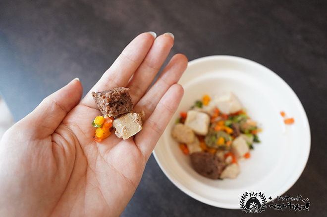 粒は小さいものから大きいものまでありました。野菜は小さめに、お肉は大きめにカットされているようです。ブルーベリーは1粒丸々そのまま入っていました。