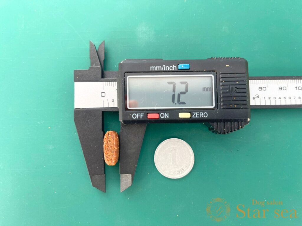 粒の硬さを硬度測定器で測ってみると、一般的なドライフードよりやや硬めではありますが、想像していたほどの硬さではありませんでした。