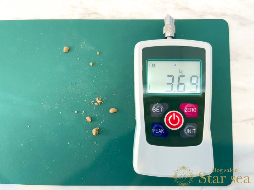 粒も硬度測定器で3.69㎏の力で砕くことができました。