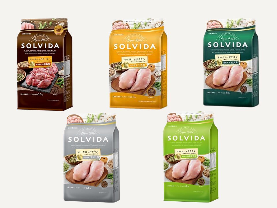 ソルビダは主原料にチキンを使用し、年齢やケア目的に合わせて選べるのが特徴のドッグフードです。