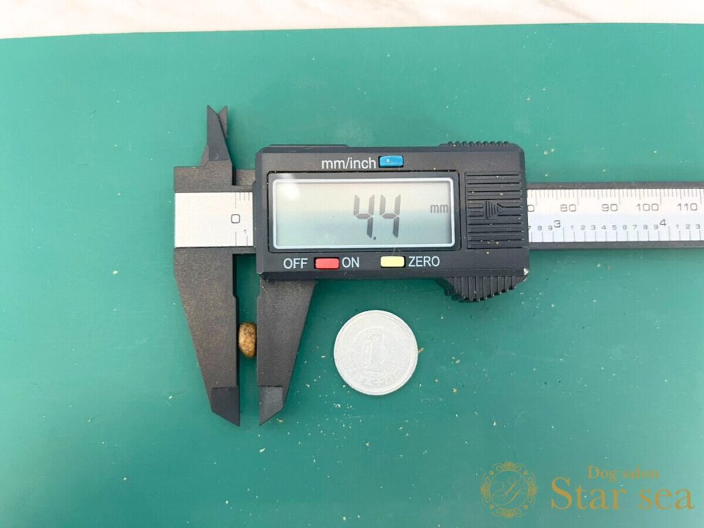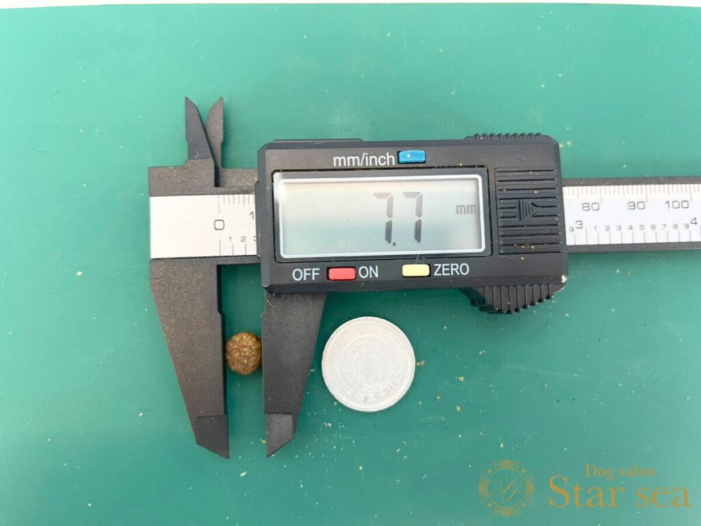 粒の大きさを測定すると直径7.7mm、厚みが4.4mm。