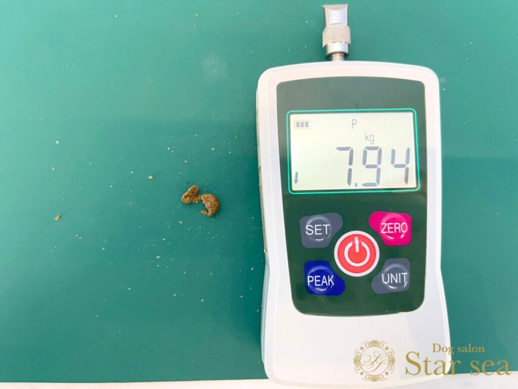 硬度測定器で粒の硬さを測ってみたところ、7.94kgという、一般的なフードよりやや硬めの数値が出ました。